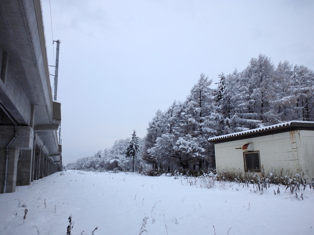 背後の林に樹氷のように積もる雪は氷点下を下回る頃には風で飛ばされてなくなります。