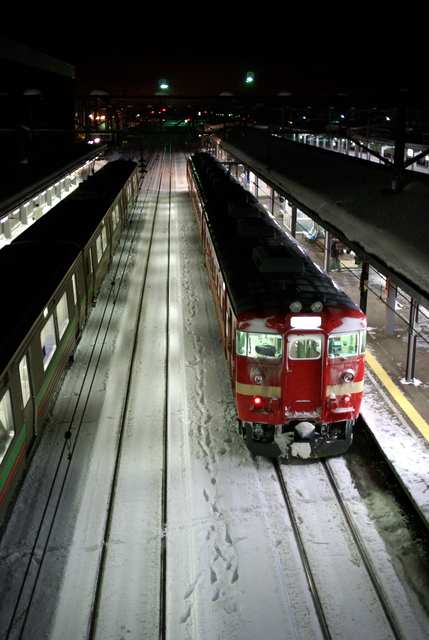 予定よりも撮影に時間を費やしたのと、夜遅かったので帰りの列車まで30分以上待つ事になりました。幸い新駅舎の暖房は暖かくいきわたっていたので、寒い思いもせずに快適でした。こういった不意に訪れる待ち時間も、夜の街の景色をただボーッと眺めながら何かを考えつつ過ごすのも悪くはありません。思ったよりも退屈もせずに帰りの列車の時間となりました。がら空きの721系6連の座席にゆったり持たれながら帰路に着きました。