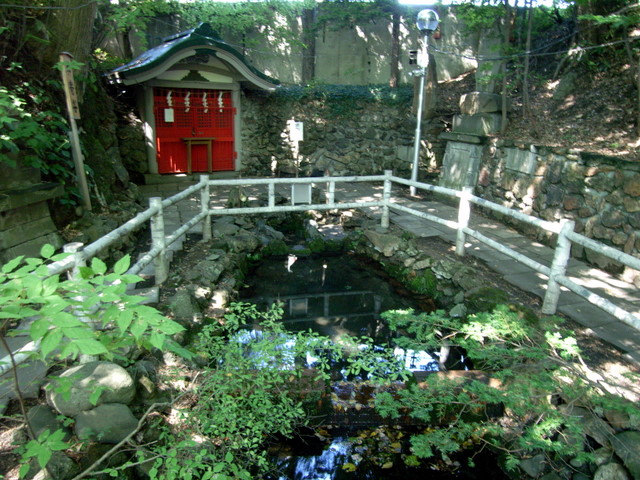 階段を降りきると小さな池とほこらが見えてきました。池の中には立派な錦鯉がたくさん泳いでいて、その中の一つが勢いよく水面から飛び跳ねていました。