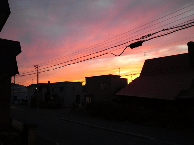 昨日、夕方の日暮れ時に自宅の窓から何気なく外を見たら、夕焼け小焼けの茜色の空がすごいことになっていました。