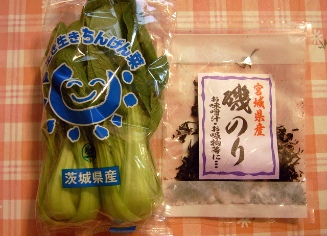 近所のスーパーで買った茨城県産のちんげんさいと宮城県産磯のり。