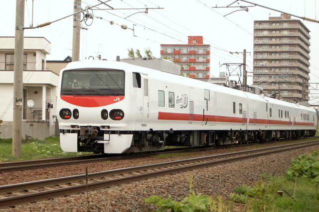 East i-Dはご存知のとおりJR東日本が所有する総合検測車です、このディーゼル仕様のDタイプのほかに見た目がそっくりな電車タイプのEと「こまち」に似た新幹線仕様があります。JR北海道は国鉄以来の軌道検測車マヤ34型は所有していますが、架線や信号などを検測できる車両は持っていません。そこで毎年一度、JR東日本からこのEast i-Dを借りて道内主要路線の検測を行っています。ところがダイヤが非公開なため、毎年来ることは分かっていても、なかなか捉えるのが困難な列車です。去年も一昨年もスルーして、今年は三年ぶりに会うことが出来ました。来年も出来ればどこかで会えるといいのですが、それは来年の運しだいということですね。