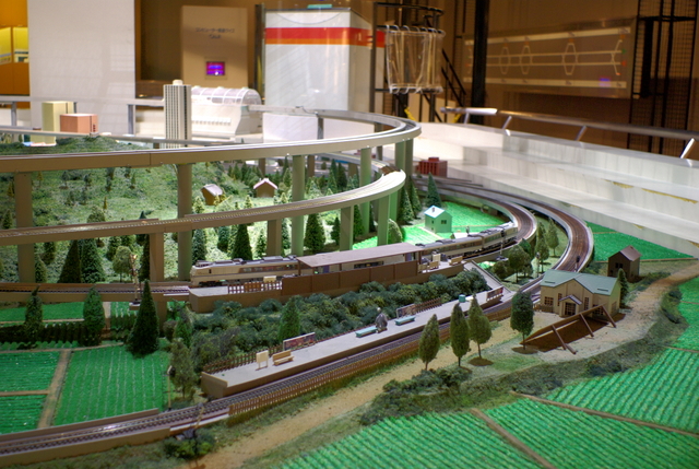少々急な階段を登って2Fへ登るとHOゲージ大レイアウトがお目見えします。これだけは見応えのある展示物ですが、走っている車両が300系新幹線と今となっては懐かしいキハ183系ダブルデッカーによるスーパーとかちです。たしか最初はキハ80系だったので、少しは時代のトレンドにあわせて進化したというところでしょうか(^^A)
