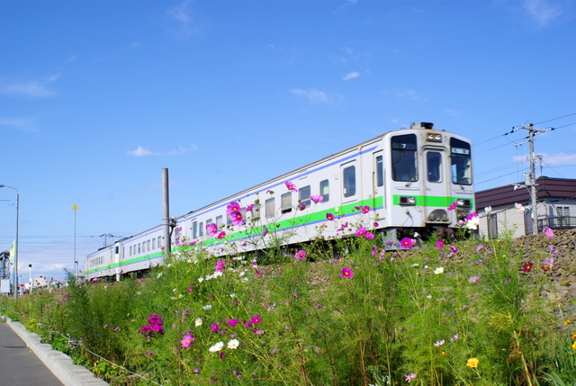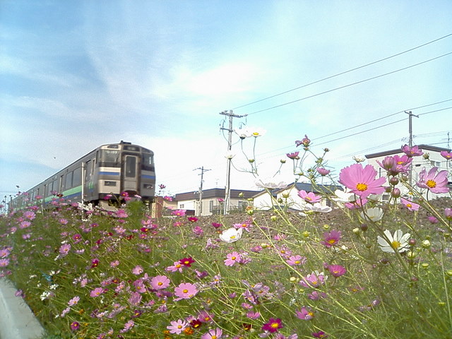 その手始めに、ようやく重い腰を上げて沿線までプチ撮影に行ってきました。場所は百合が原公園~篠路間です。ここには線路端にコスモスが群生しているので、それと行き交う列車のコラボを狙ってみました。