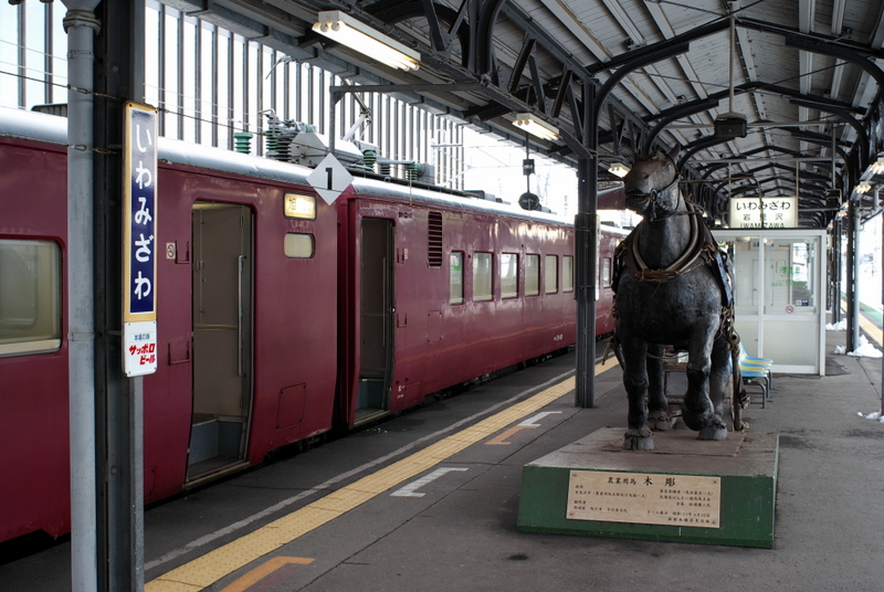 岩見沢の歴史を象徴する農耕ばん馬の木像と赤い電車のオリジナル復刻色のおなじみの取り合わせが見られるのもこの日が最後でした。