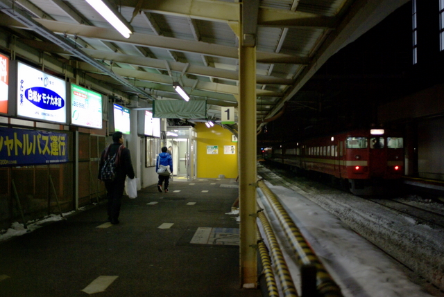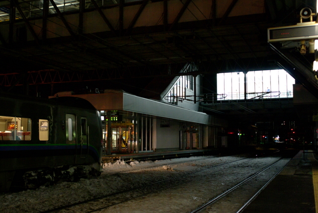 すでに明りが灯る新駅舎を前に停車しているのは、日に1本だけ止まる旭川行エアポート/カムイ。同列車を見送って帰路につきました。