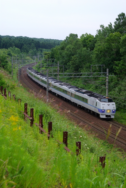 世間では明日からお盆休み、それにあわせて1080レも運休や単機回送となるようなので、今日はシメの撮影に出かけてきました。先ごろ入手した新兵器を携えて因縁の厚別カーブまで来ました。到着してしばらくすると、見覚えのある青いスポーツカーがやってきました、先日も一番町でご一緒したR氏でした。踏み切り横で談笑していると程なくして1080レ通過、結果はご覧のとおりです。