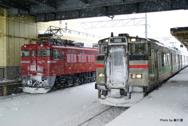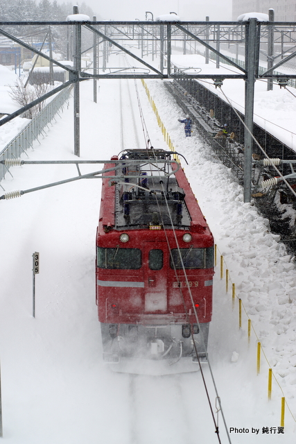 ED79はもともと奥羽線用ED75-700番台の改造ですから新製されてから一番新しくとも32年もたっているのですね、この9号機も今は新車のようにピカピカですが本来の運用に戻ったあとは海底トンネルの塩分にやられてすぐにくたびれた姿になってしまうのでしょうね。青函トンネルの開通以来、ヌシとして君臨してきたED79ですが北海道新幹線が函館まで開通すれば全機引退は確実でしょうから記録できるうちにしっかり記録しておきたいものです。単機で颯爽と駆け抜ける姿を見ていて、やはり機関車は後ろに牽くものを従えていたほうが絵になるなあと思いました。ED79が引退する前にSLニセコ号用の旧型客車と組み合わせて小樽~旭川間に企画列車を走らせてくれたらサイコーなのになぁ~、などと妄想を膨らませてしまいました。