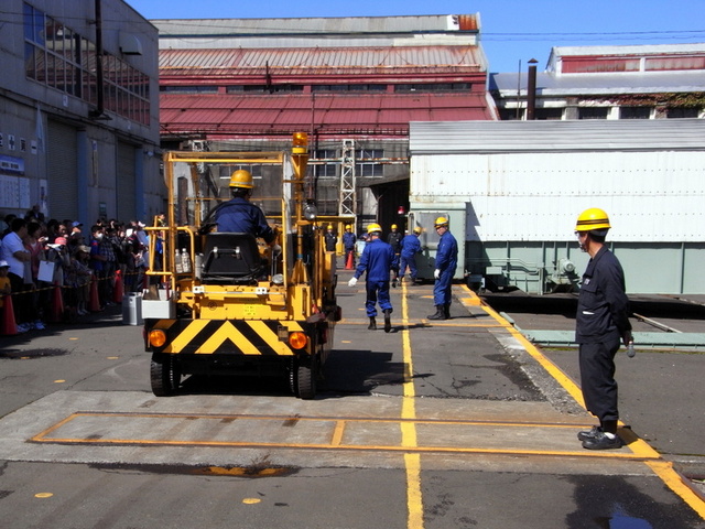 前回の記事に引き続いて苗工一般公開の様子です。付近を歩いているとトラバーサーによる移動実演が始まるというアナウンスが聞こえたので見学して見ることにしました。実演が始まり左の棟から出てきたのは車両移動用特殊車両のアントです。ちなみにアント一台新築の家一軒分の値段だそうです(汗)