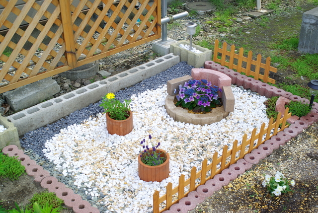 全部お花畑にすると短調になるので、玉砂利を敷いて庭園風にしてみました。