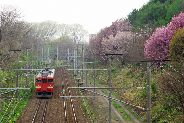 場所は去年と同じ酪農学園近くの歩道橋です。このあたりは札幌圏でも桜と列車のコラボが手軽に撮れる数少ない貴重な場所ですね。