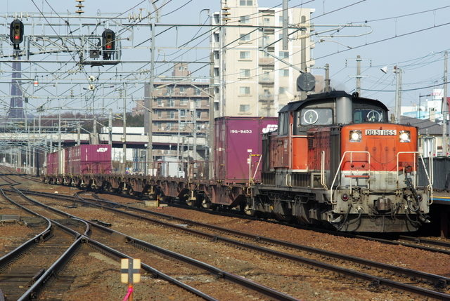 その場所は新道を越した先のJR貨物研修所の前の線路際。ここで到着した1080レを撮影、目の前で解決、入れ替えDEへの付け替え作業が見られることで知られている場所です。今日は原色1067号機でした(^^)