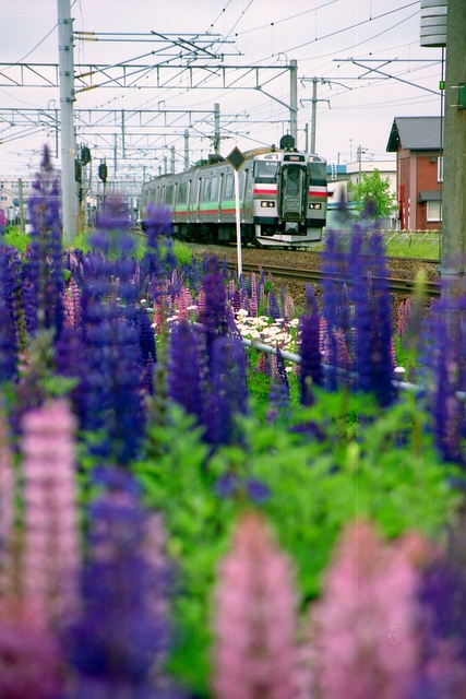 今日はレンズを望遠から準広角に持ち替えて撮影しました。線路際手前のルピナス畑もピークをむかえ、原色先頭のDDとイイ感じでコラボしていると思います。