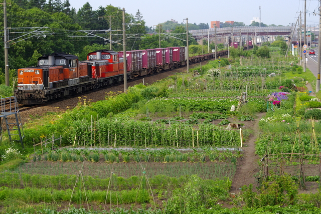 完全引退が間近に迫っている原色DDだけではなく、写真後ろのA更新もそう遠からず何らかの動きがあるようなので、近い将来に北海道における貨物のDDはB更新のうち必要な分だけが残るという状態になりそうです。それでも長らく続いたDFの新製が来年度は2両に止まり、それ以後は打ち止めされるという噂もあるらしく、もうしばらくは北の大地におけるDD貨物の活躍が見られそうです。