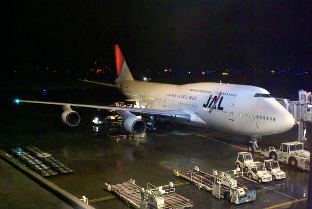 空港のロビーから出発待ちのジャンボ機が見えました。となりのエアDoと比べても断然デカイですね。やがて搭乗通路が外され牽引車に押されながら移動、滑走路へ着くとしばらく待機したあと一気に加速して飛び立っていきました。