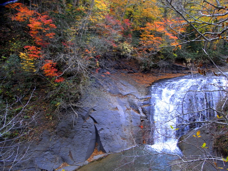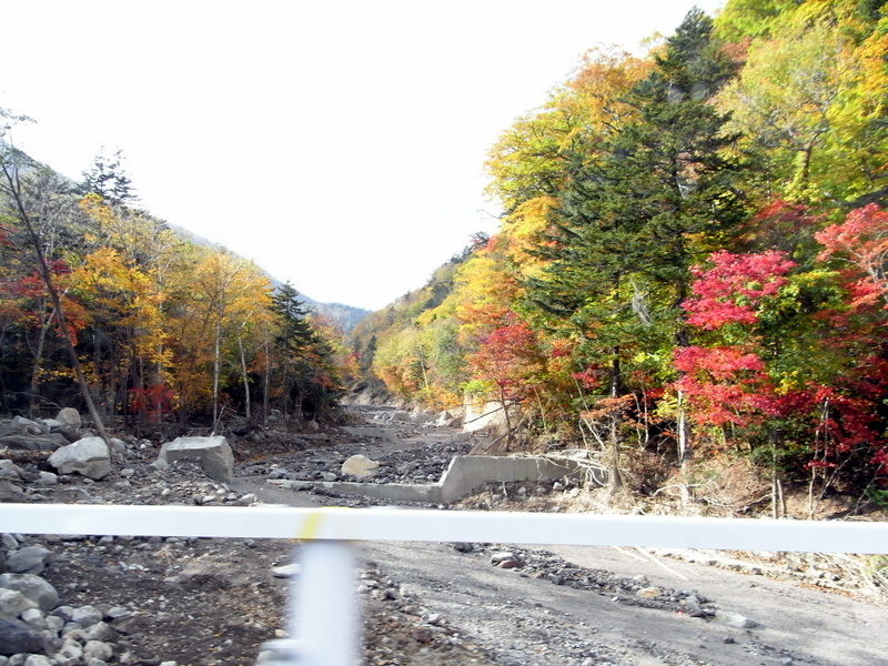 こちらも渓流沿いの紅葉が十分色づいていました。ここは豪雨の被害も少なく無事な感じでしたが、その上流や下流には想像以上の爪痕がいくつも垣間見られ驚きました。