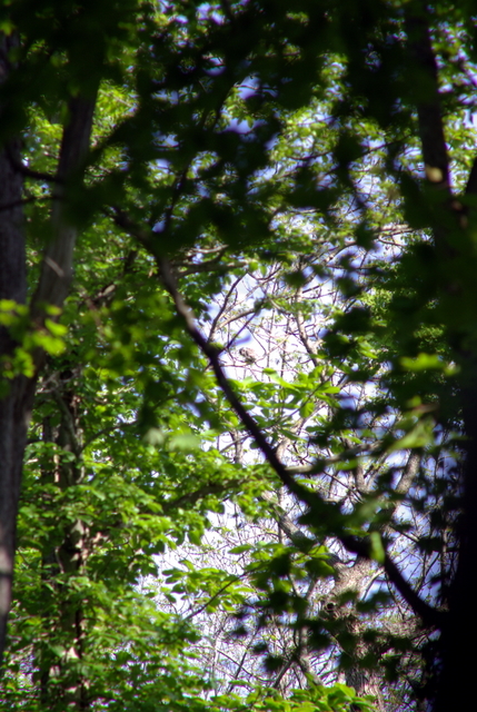 その方の三脚の横から角度を割り出し、手持ちの望遠レンズで何とか写しとったのが左の一枚です。画面中央の木々の枝葉の合間に小さく写っているのがフクロウです。
