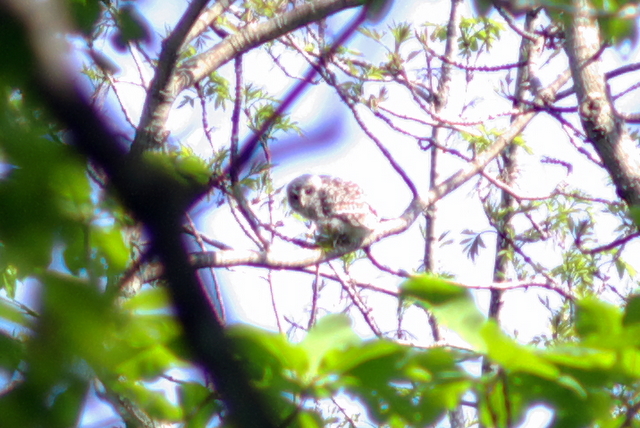 一足先に輪に加わっていた母が手招きして呼ぶので行ってみると、数人のカメラマンの方たちが、立派な三脚にごっつい望遠レンズをくくりつけて、森にめがけて一斉に砲身を向けています。そのうちの一人の方が望遠鏡がわりにとファインダーを自由に覗かせてくれたので、見てみるとフクロウの幼鳥が枝の上に佇んでいました。