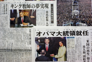 中継が始まってまもなくブッシュ(親父)、カーター、クリントン元大統領夫妻や各界の著名人などが入場して、その中にブッシュ前大統領の姿ももちろんありました。全員が出揃ったところでミッシェル夫人と娘たちが現れて、少し間をおいて最後にオバマ新大統領が入場しました。間は飛ばしますが、ミッシェル夫人が手に持ったリンカーン大統領が実際に使用した聖書にオバマ新大統領が左手を置き、右手をかざして宣誓していました。そのあと、ソウル歌手の歌やクラシックの演奏が続いたあといよいよ大統領就任演説が始まりました。(以下、つづく)