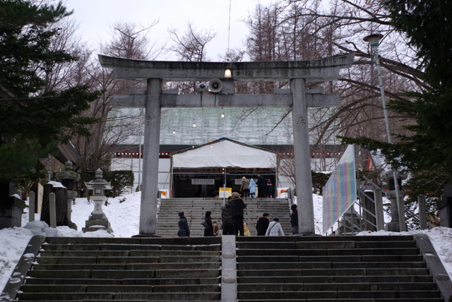 南小樽駅を出て山の方へ歩くと程なく神社の前へ、もっと人出があるかなと思っていましたが、ちらほら見受けられる程度、出店も閉店状態でちょっと寂しい風情。