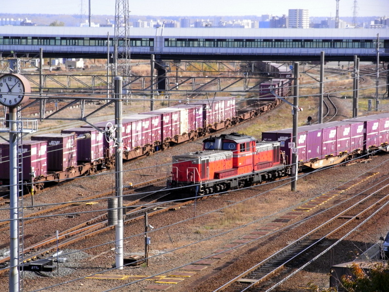 札幌貨物ターミナルの広大な敷地を横切る平和駅連絡歩道橋は格好の観察場所ですが、青天井の先代から建て替えられた時に総密封窓仕様にされて撮影条件に関しては不便になりました。窓ガラスにレンズ先端のゴムフードを密着させて余分な反射を極力抑えて撮影してきましたが、今日行ってみると窓の曇りが尋常ではなく特にターミナルよりは殆ど全滅状態で撮影に苦労しました。証拠に撮ったカットはソフトなメルヘン調になっています。