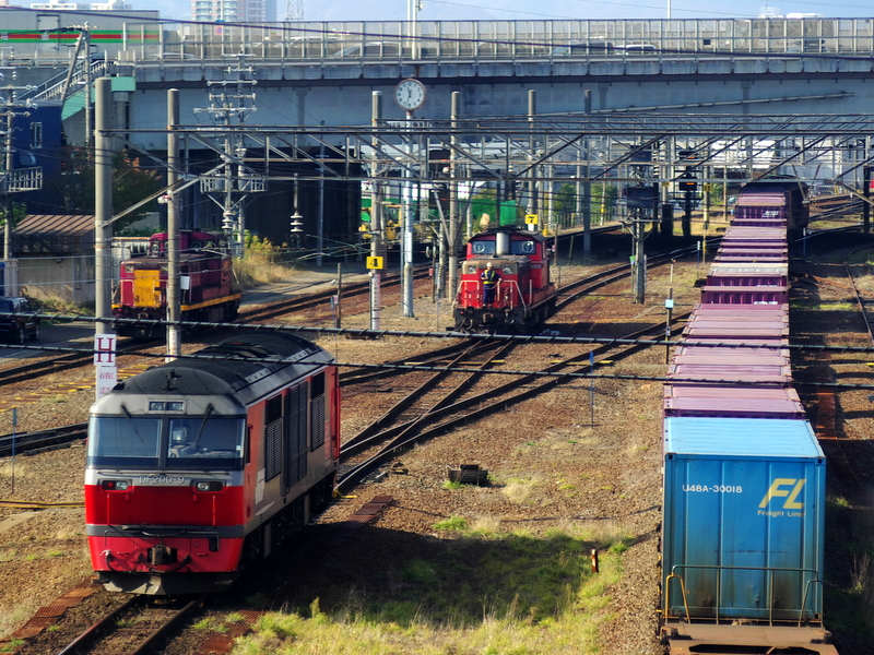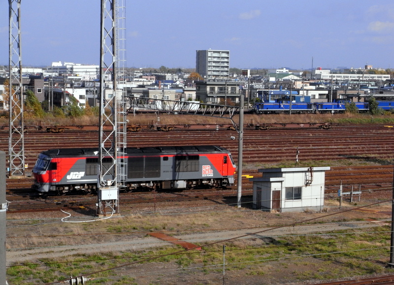 ヤードの上を横切る札幌新道の歩道から奥の千歳線を通過する北斗星の青いDD重連とのクロスを狙いましたが残念ながら1~2分ほど入換の方が早く通過して叶いませんでした。そう簡単にミラクルは成立しませんね。その代わりに本線牽引してきた赤熊さんの帰区とタイミングが揃いました。