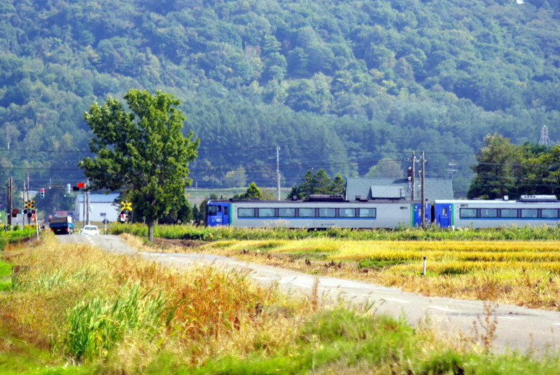 右も左も田んぼが拡がる一本の道路をアングルを探しながら行ったり来たりしていると踏切が鳴り始めました。その場で立ち止まり望遠レンズのまま構えていると3両編成のミニ特急サロベツがやって来ました。