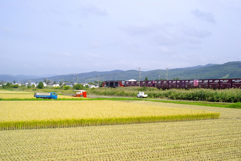 再びポジションを変えて今度は線路に近づくと、目の前の田んぼの区画で収穫作業がたけなわでした。再び踏切が鳴り始めると今度は貨物列車が通過していきました。予想外の登場でしたが石北貨物のシーズンということで北見まで玉ねぎを積みに向かう臨時列車だと思われます。