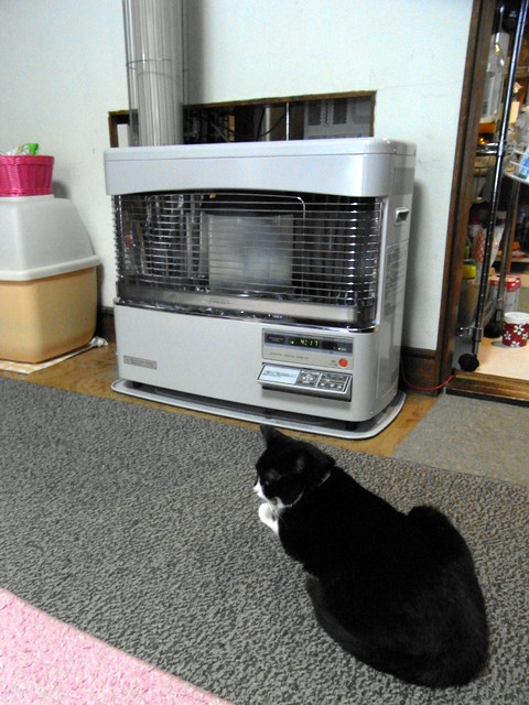 ところがあっという間にストーブの出番となる季節がやって来ました。ももさんことニャンちょんさんもストーブの前で待機しています。