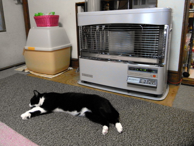 最後の一手間としてストーブ背後の吸気用シロッコファンを取り出し羽の隙間に詰まったホコリを取り除きます。けっこう面倒くさい作業ですが、これをやっておくと燃焼効率が良くなって同じ火力設定でも温かみが増します。すべて異常が無いことを確認して試運転を開始、徐々に温かみがました頃ニャンちょんさんがビロ~ンと思い切り伸びきっていました。