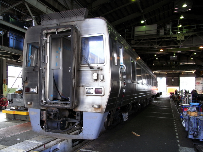 続いて訪れた整備棟の中にキハ282-2001が仮台車を履いた状態で留置されていました。