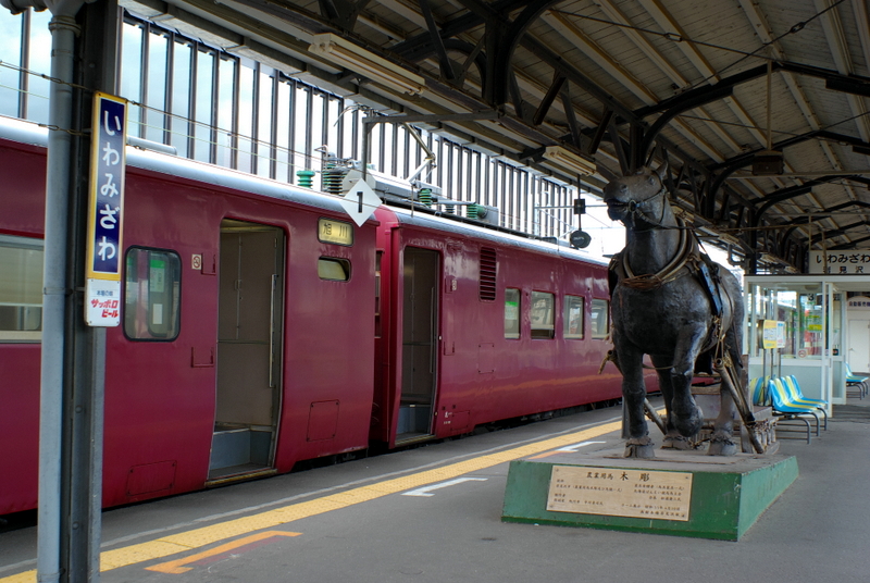 岩見沢駅3番線ホームにおなじみのばん馬木像が鎮座しています。かつて名物だったと言わなければならいのですが、長らく岩見沢市の風物詩だった重量級のばん馬が鉄そりを引くばんえい競馬は廃止されてから久しく月日が経ってしまいました。年に一度のイベントなどで復活させることは出来ないものでしょうか。