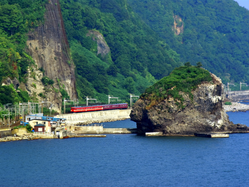 名撮影地として名高い張碓の恵比寿岩付近を通過。今日は快晴のマリンブルーと復刻色S-110編成先頭という絶好の条件から崖上の足場には三脚の列ができていたと想像されます。