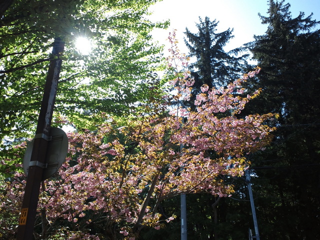 遅咲きの八重桜を太陽の光越しにパチリ。