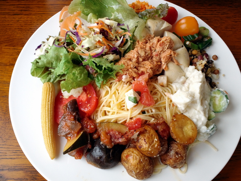 自分でよそってしまった大量の野菜料理をはたして食べきれるのか心配でしたが、待ち時間が長かったこともあって、全てぺろりと平らげて難なく完食、食後のコーヒーとデザートのひとくちケーキと抹茶バニラアイスまで美味しくいただきました。