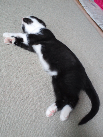わが家に来てから、かれこれ三週間ほど経ちましたが、すっかりリラックスして家ネコ化してます。