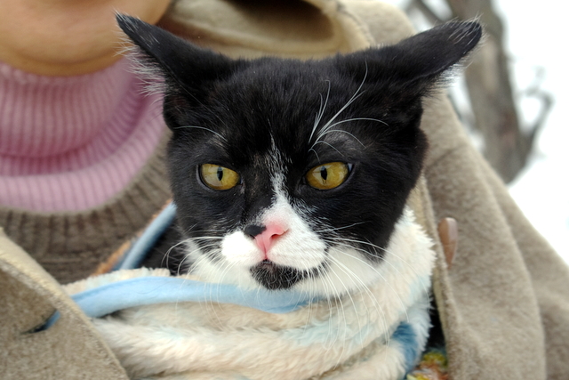 わけも分からないうちに車に詰め込まれ寒風吹く参道に連れだされたももさん。気持ちリアルな面持ちになってます。いつもの鉄道利用から自家用車に変更になった理由はこれでした。JRさんごめんなさいm(_ _)m