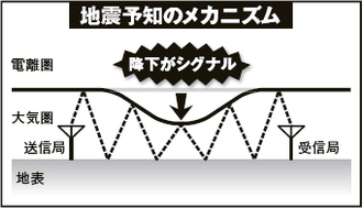 電気通信大学の早川名誉教授が考案された地震予知方法で、大きな地震が起きる直前にその地域の上空の電離層に変化が起きて、そこに反射する電波の到達具合が変わることを観測して予知につなげるという方法です。