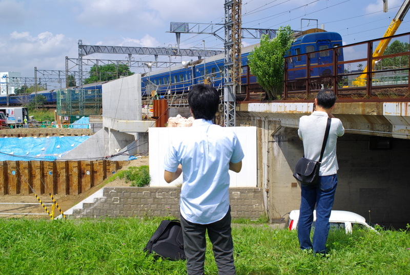 くもりと日照りを繰り返す空模様の下で待っていると北斗星通過20分前くらいになると、まわりに続々と人が集まり始め、気が付くと自分のまわりには三脚の列とカメラを構えた人たちがズラリと並んでいました。