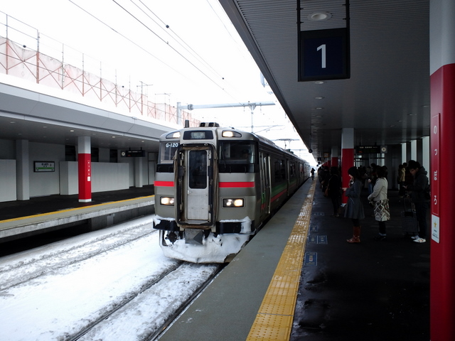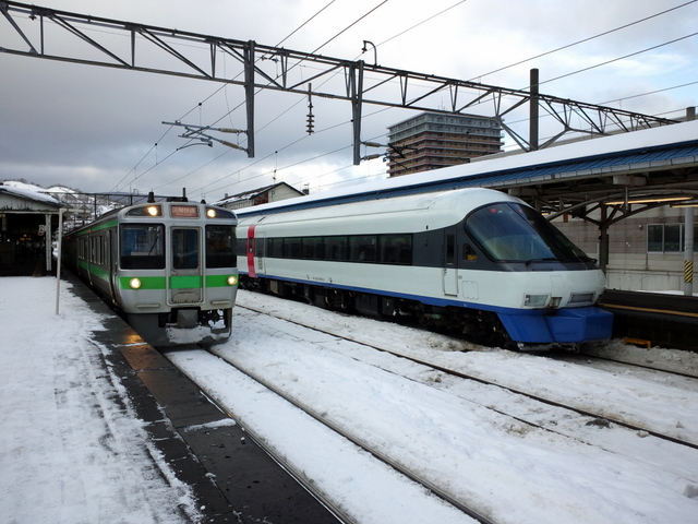 721系トップナンバーF-1編成とニセコスキーエクスプレス。この後すぐに発車していったニセコEXPはガラガラでした。