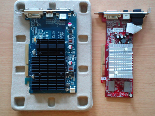 左の青いボードが新しいRADEON3450で右の赤いボードが今まで付いていたRADEON9550ボードです。