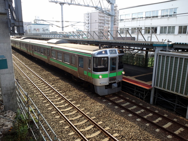 まずは手始めに歩道橋通路から下りホームに停車する721系普通列車の一枚を。