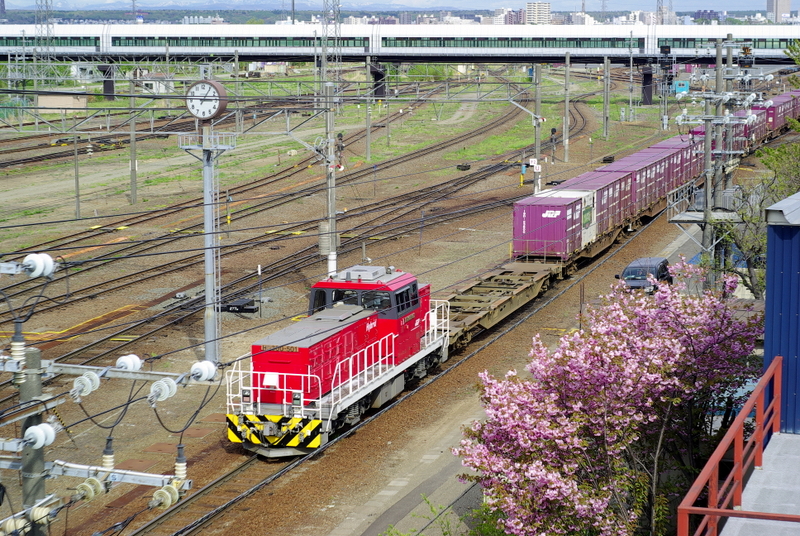 気を取り直して視線を手前に戻すと、目の前に遅咲きの八重桜が見頃を迎えている様子が目に止まります。以前からのこの場所の桜は電車の車窓から目についていたので気になる存在でした。もとの主だった国鉄型機関車たちが活躍しているうちには間に合いませんでしたが今日ようやくハイブリッド機関車とのコラボを撮影することが叶いました。
