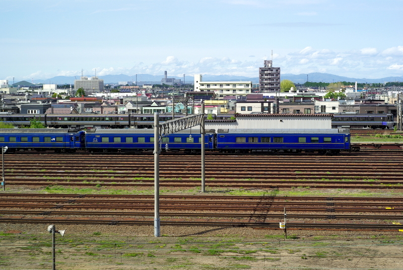 視点を遠くへ向け直すと、今年の3月で御役目を終えた定期北斗星用青い客車群が大量に縦列駐車していました。
