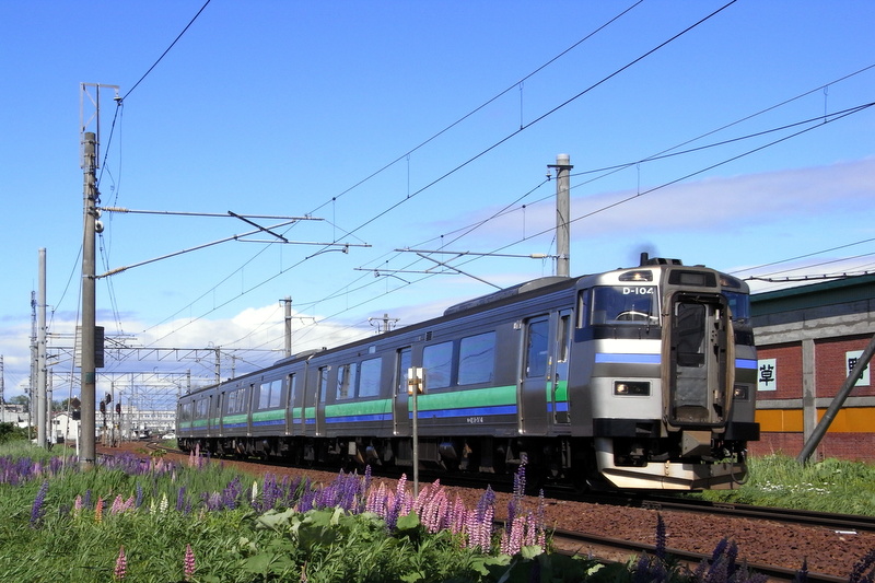 一定の間隔で行き交う普通列車や区間快速を撮りながら構図を見定めます。晴れた青空のもと江別を発車したキハ201系区間快速も気持ち良さそうに加速していきます。