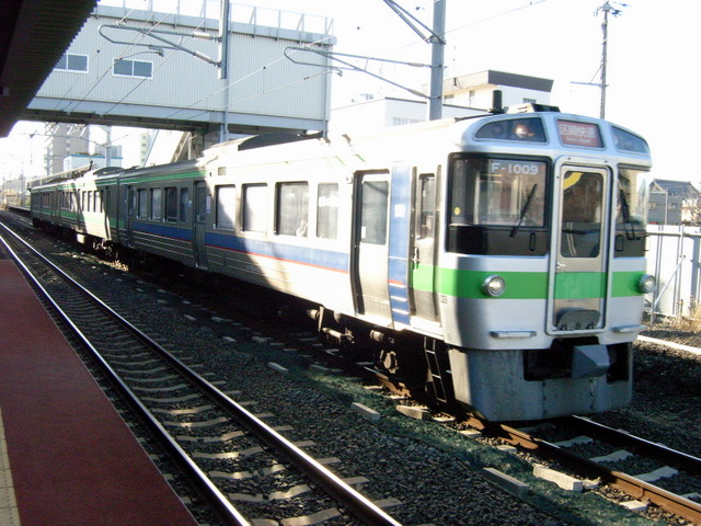 野幌駅で列車を待っていると、反対からやってきたのは単独運用中のF-1009編成でした。