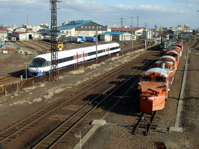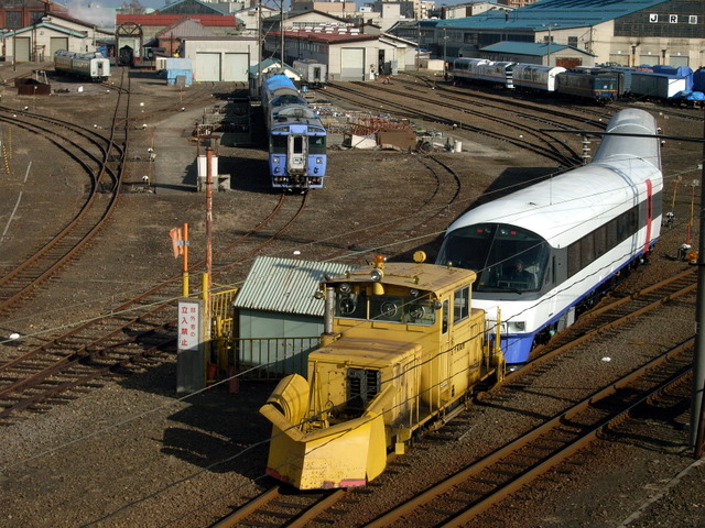 改札を出て苗工ウォッチングの跨線橋へ向かいます。ちょうど試運転を終えて定位置に戻ったニセコEXPと、こちらは北海道で本業の除雪作業に当たる冬姿のDE15群とツーショット。