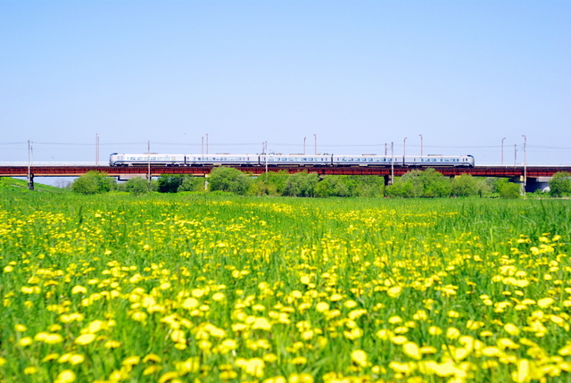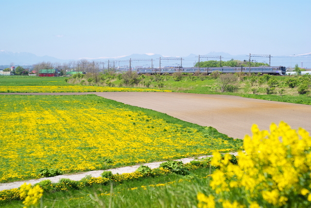 途中、河川敷で菜の花(アブラナ?)が綺麗に咲いていたので、橋とは反対の風景にカメラを向けました。手前に菜の花を添えて丁度良くやってきた785系をパチリ。河川敷とは一味違った、牧歌的な風景の一枚になりました(^^)