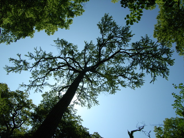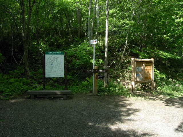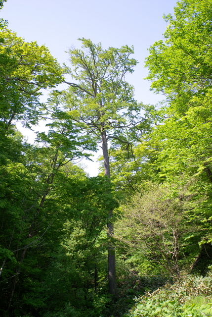 しばらく単調な森の中を進みますが、沢筋の谷へカーブしながら下った先に、細く長く一直線にそびえ立つ一本のカツラの大木が目に入ります。