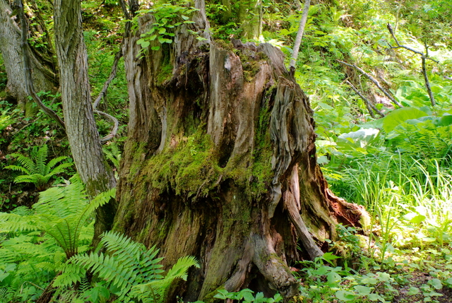 するとこれまた立派な大木であっただろう大きな切り株に出会います。原始林と呼ばれる野幌森林公園でも、こうした太古の自然から存在した大樹は、大沢口付近や一部の沢筋などに点在するだけで、あとはほとんど伐採した後の人工林なのだそうです。